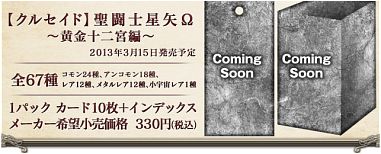 Conforme divulgamos recentemente, um segundo volume dos cards da linha Crusade tematizados com o anime Os Cavaleiros do Zodíaco Ômega está confirmado para ser lançado no Japão no dia 15 de Março de 2013. Este segundo lançamento será focado nos Cavaleiros de Ouro e terá 67 cards. As primeiras imagens foram divulgadas.