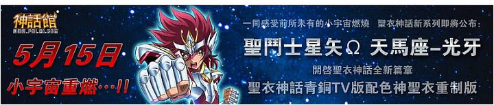 Para comemorar os 10 anos da linha Cloth Myth, a Bandai promete anunciar várias novidades no próximo dia 15 de Maio de 2013. Inclusive um SITE ESPECIAL foi criado e será aberto neste dia. Além disso, no último final de semana, no intervalo do episódio de Ômega, foi exibido um comercial de TV sobre o assunto. Assista logo abaixo: DUAS ANTECIPAÇÕES: Em paralelo ao anúncio do site especial da Bandai, nesta semana tivemos dois "furos" que podem antecipar o que está por ser anunciado oficialmente no dia 15. O primeiro veio do site chinês Folei.com, onde um banner com o Kouga foi divulgado, anunciando uma linha Cloth Myth da série Ômega. O segundo veio do Brasil, pelo pessoal do fórum Cloth Myth Brasil, onde eles confirmam que a Bandai relançará os bonecos dos Cavaleiros de Bronze com Armaduras Divinas, mas desta vez com melhorias (similar a linha EX).
